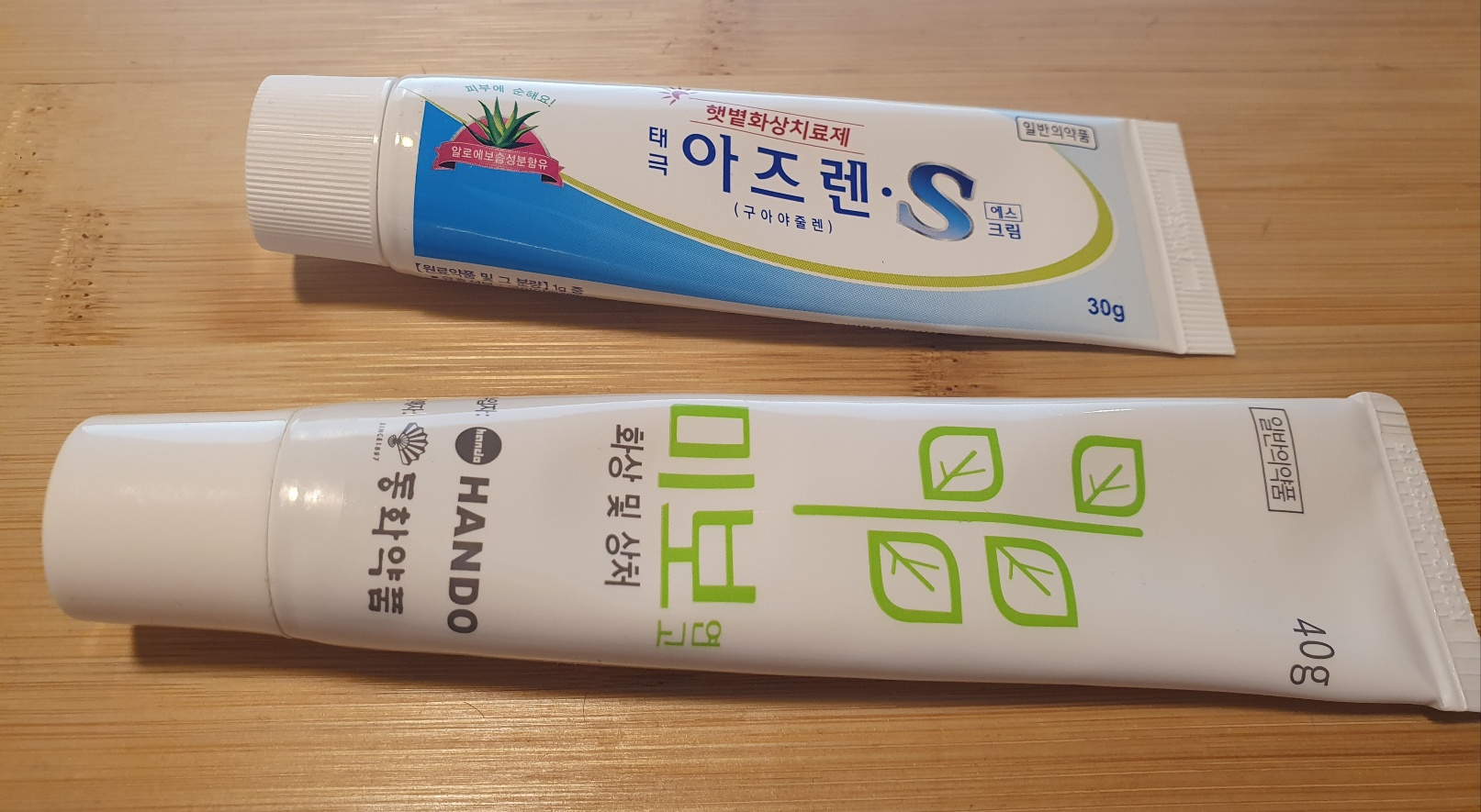 가벼운 1도 화상일 경우에는 아즈렌연고를 물집이 잡힌 2도 화상일 경우에는 우선 병원에서 치료를 받은 후에 약국에서 미보연고를 발라주도록 합니다.